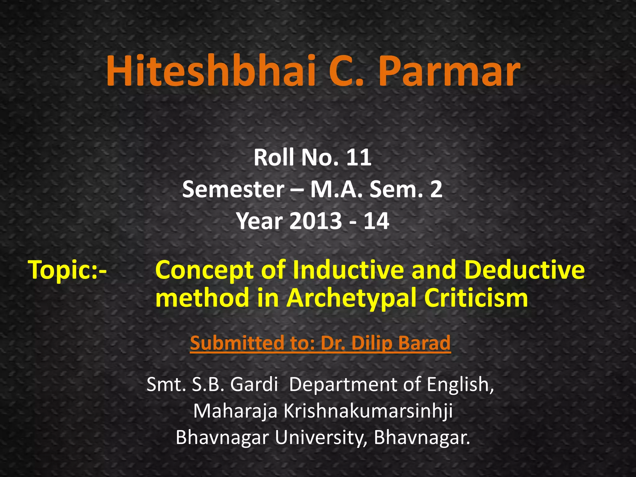This document discusses inductive and deductive methods in archetypal criticism. It provides examples of how each method can be used to analyze Oliver Twist by Charles Dickens. The inductive method proceeds from specific examples in the text to draw general conclusions, such as describing Oliver Twist as a "dark novel" based on its religious conflicts, class conflicts, victimization of women, and depiction of child labor. The deductive method proceeds from general archetypes to specific examples, such as analyzing the character Fagin as a villain based on his pickpocketing, ugly looks, darkness, brutality, cruelty, and temptation of money. In conclusion, the document states that literature can be interpreted in many ways using these methods