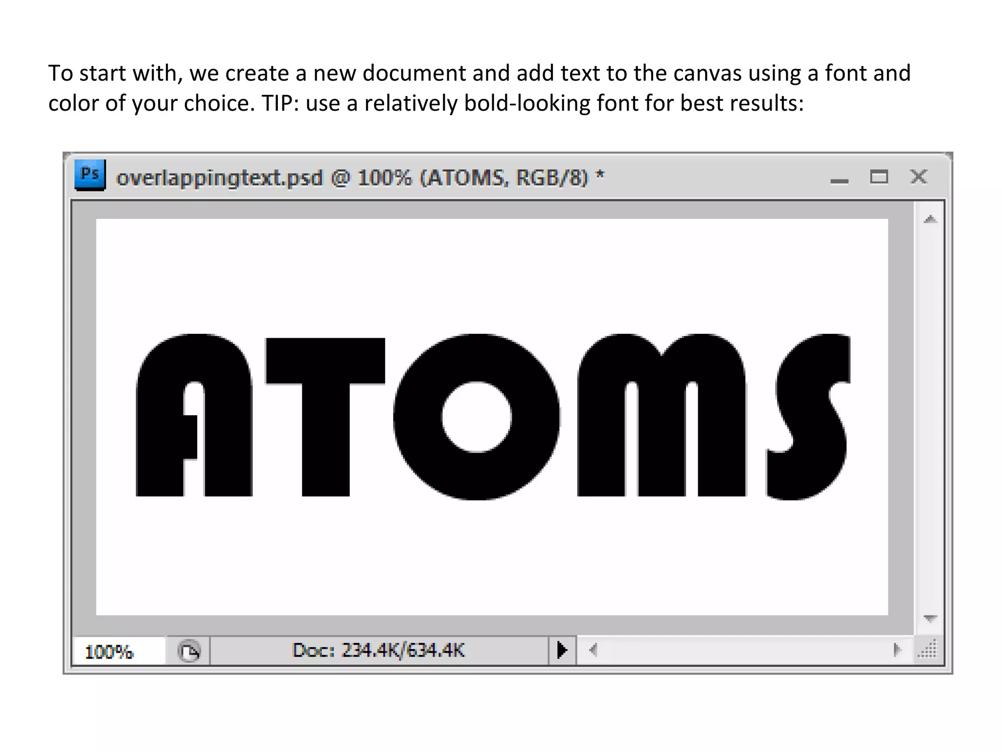 The document describes how to create an overlapping text effect in a few steps: 1) Add text to a document and convert it to shapes. 2) Select the whole word using the pen selection tool and exclude overlapping areas. 3) Drag each letter individually to create overlaps between letters. 4) Transform individual letters by rotating or modifying them further.