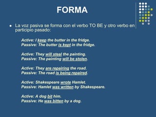 The document discusses the passive voice in Spanish. It provides examples of changing sentences from active to passive voice. The passive is formed using the verb "to be" and the past participle. The agent is sometimes included after "by". Exceptions include verbs with two objects, reporting verbs, prepositional verbs, and causative verbs like "have" and "get". The passive voice is used when the agent is unknown, unimportant, or to focus on the object rather than subject of the sentence. Exercises are provided to practice changing sentences between active and passive voice and translating sentences between Spanish and English.