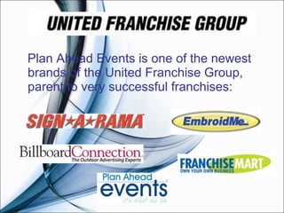 Plan Ahead Events is one of the largest event management companies in the world, with offices across North America and expanding into other regions. They provide full event planning services from concept to completion for corporate meetings, special events, trade shows, and other business functions. Studies have shown that event marketing provides the highest return on investment of any marketing platform, as it allows for in-person engagement and relationship building. Plan Ahead Events works with each client individually to find ways to enhance revenue and value from events while keeping costs low.