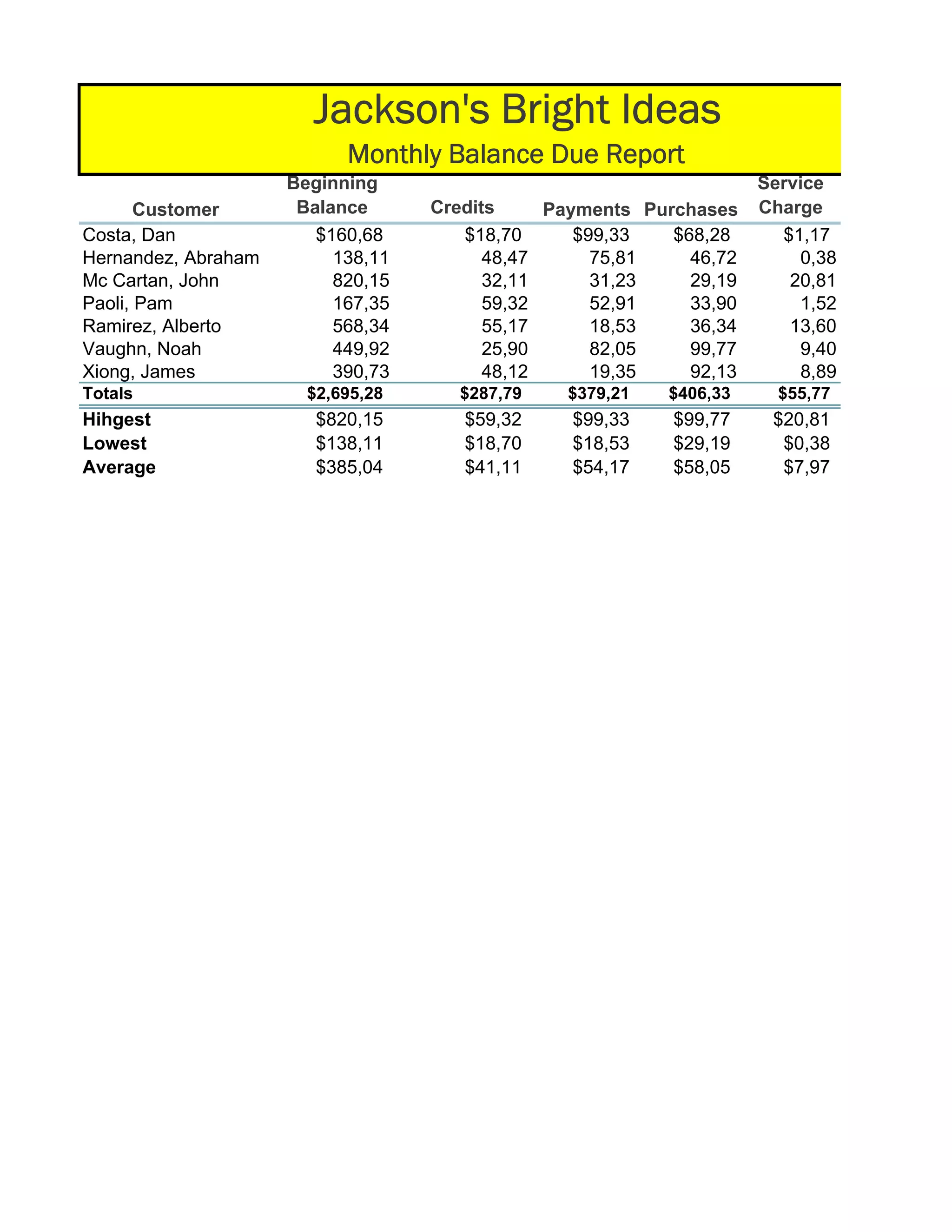 This monthly balance due report from Jackson's Bright Ideas shows account information for 7 customers, including beginning balance, credits, payments, purchases, service charges, and new balance. It provides totals, highest, lowest, and average amounts for each column. The customer with the highest new balance is John Mc Cartan at $806.81, and the lowest is Abraham Hernandez at $60.93.