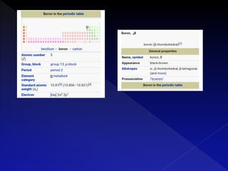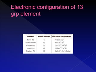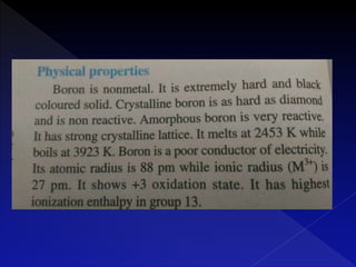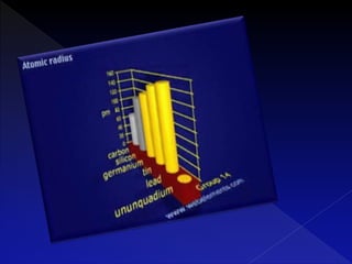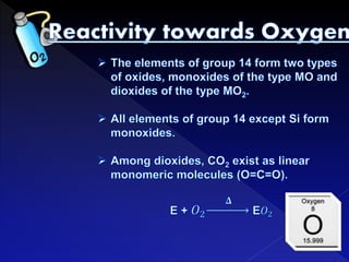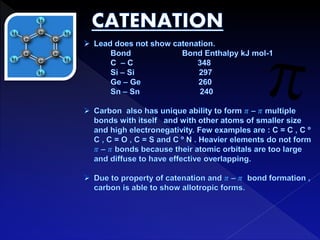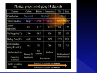 The document discusses the properties of group 14 elements. It notes that carbon and silicon are non-metals, germanium is a metalloid, and tin and lead are metals. It discusses their electronic configurations, atomic radii, ionization energies, electronegativity, oxidation states, and physical properties. Carbon exhibits allotropes like diamond, graphite and buckminsterfullerenes which have the same chemical composition but different physical properties. Diamond has a high melting point and hardness due to its strong covalent bonds.
