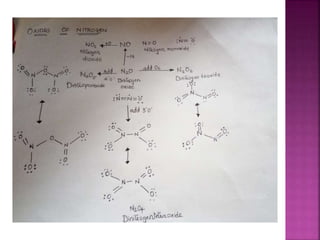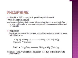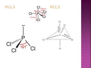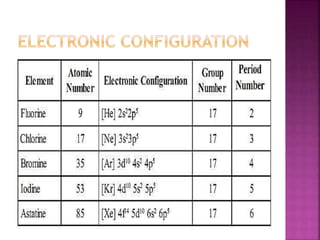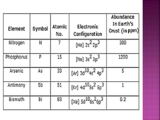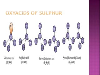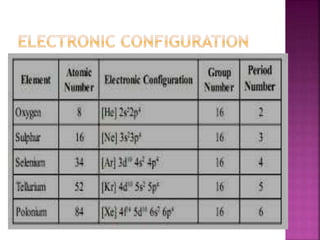 The document discusses the group 16 (oxygen family) elements of the periodic table. It covers their general electronic configuration of ns2np4, trends in periodic properties like atomic radius and ionization energy decreasing down the group. It describes the common oxidation states of -2, +2, +4 and +6. It also discusses the formation of hydrides, halides, oxides and reactions with air, acids, alkalis and metals for these chalcogen elements.