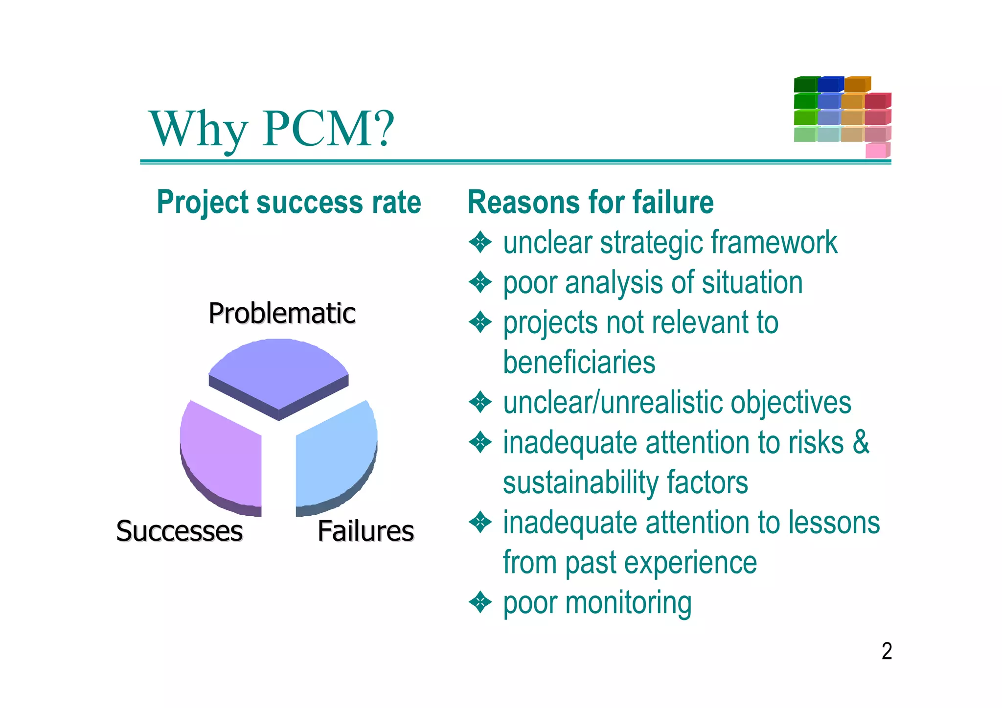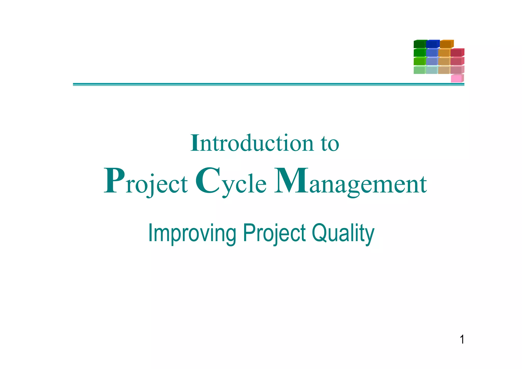 The document provides an introduction to project cycle management (PCM) and improving project quality. It discusses that PCM follows the phases of the project cycle using the logical framework approach as its core design and management tool. It emphasizes beneficiary involvement in decision making and building sustainability into project design. The document outlines the basic characteristics of PCM, the key phases of the project cycle, major documents used, and factors important for project quality such as relevance, feasibility and sustainability.