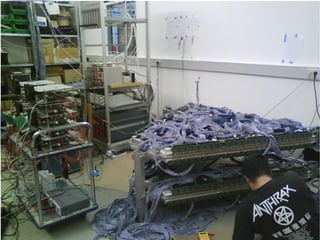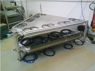 The document provides an overview of the HADES RPC ToF Wall cosmic ray commissioning project. It discusses (1) the instrumentation of the 6 RPC sectors and initial cosmic ray testing, (2) the collection of approximately 50 days of cosmic ray data totaling 895 GB, and (3) preliminary analysis of cosmic ray tracks using the TimTrack algorithm, including reconstructed position and time results. The aim is to validate the RPC detector performance before data taking with particle beams begins.