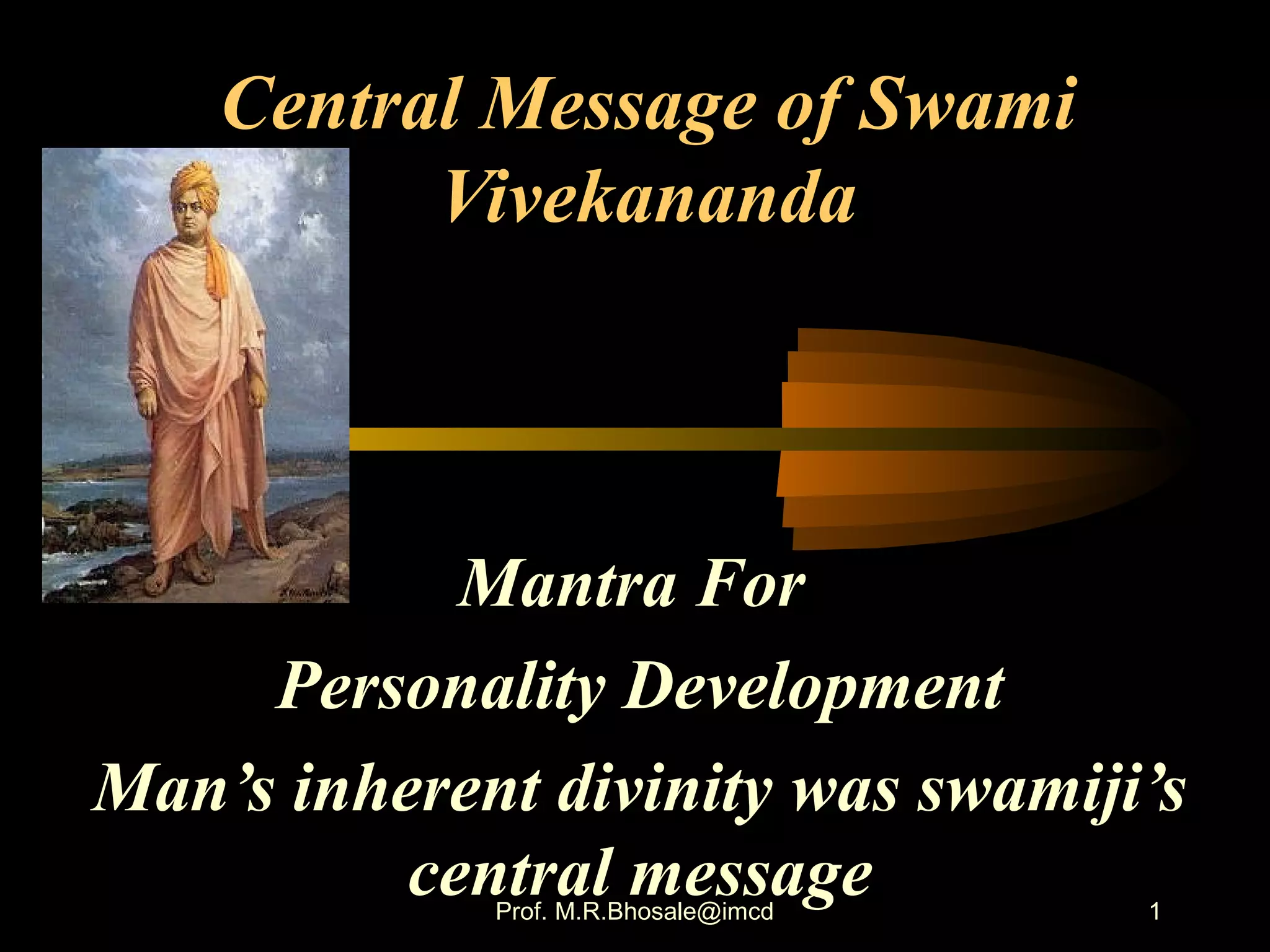Swami Vivekananda's central message was about man's inherent divinity. His famous quote that can be used as a mantra for personality development is "Each soul is potentially divine. The goal is to manifest this Divinity within by controlling nature, external and internal." The document discusses the fourfold functions of the mind - memory, deliberations, determination/decision-making, and 'I' consciousness - and how strengthening willpower can develop one's personality across physical, energy, mental, intellectual, and blissful dimensions by progressing beyond identification with just the physical and exercising higher mental faculties. Personality development involves struggling with and overcoming the lower mind characterized by desires, old habits, wrong tendencies