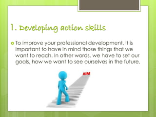 This document outlines steps for professional development. It recommends setting goals in areas like language skills, organization, and teaching methods. Specific actions are proposed like using a calendar, seeking information online, and practicing hobbies. It also suggests evaluating one's skills and weaknesses, being open to changes in one's field, and making a record of accomplishments. Working as part of a team and enjoying one's work are also emphasized as important for professional growth.