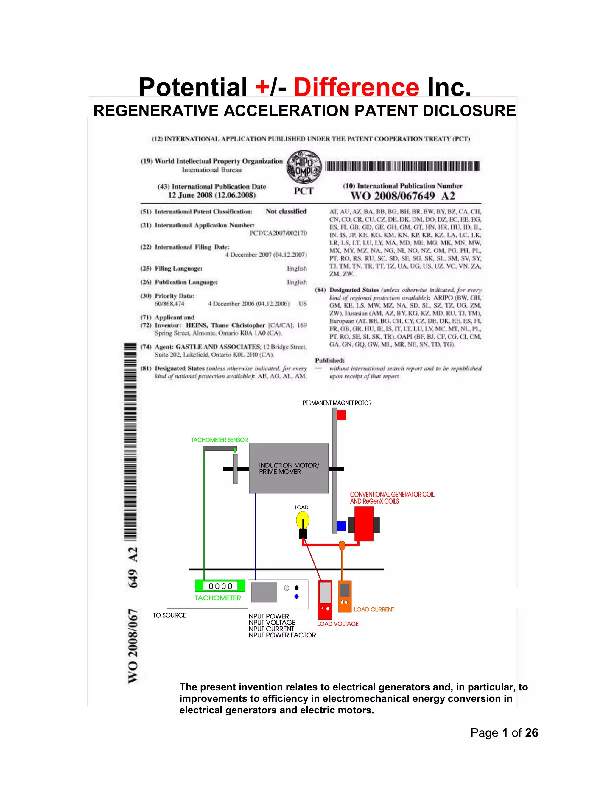 This document provides a disclosure for a regenerative acceleration generator patent. It describes improvements to electrical generator efficiency by utilizing a Regenerative Acceleration (ReGen-X) coil design. The ReGen-X coil is able to delay current flow until the generator's rotor reaches top dead center, where inductive reactance is minimized. This allows the coil's magnetic field to assist rather than resist the rotor's motion, increasing efficiency by reducing the torque needed from the prime mover. The document provides background on conventional generator operation and explains how the ReGen-X coil design functions to reverse the decelerating effects of armature reaction through delayed current flow and flux harvesting between multiple coils.