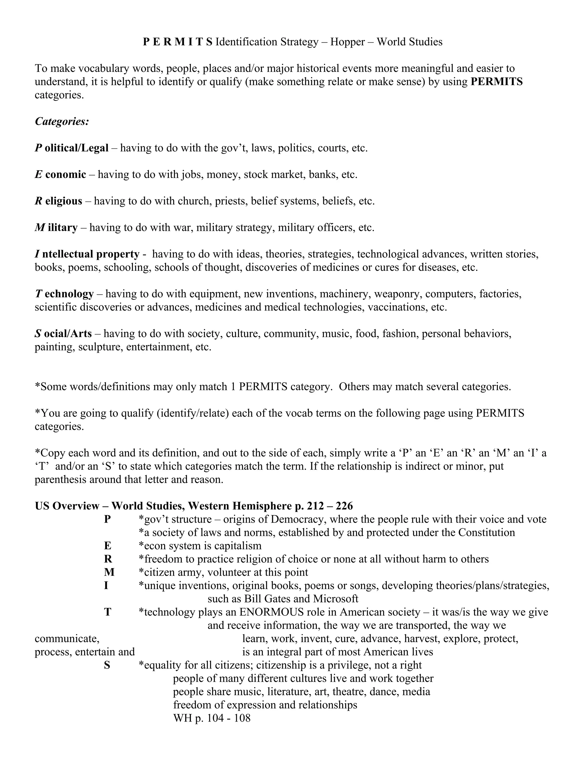The document introduces the PERMITS strategy for summarizing vocabulary words, people, places, and historical events from documents. It explains that PERMITS stands for Political, Economic, Religious, Military, Intellectual property, Technological, and Social/Arts categories. Keywords or concepts can then be assigned one or more PERMITS labels to help relate them to different contexts. An example is then provided analyzing the US overview text using the PERMITS strategy.