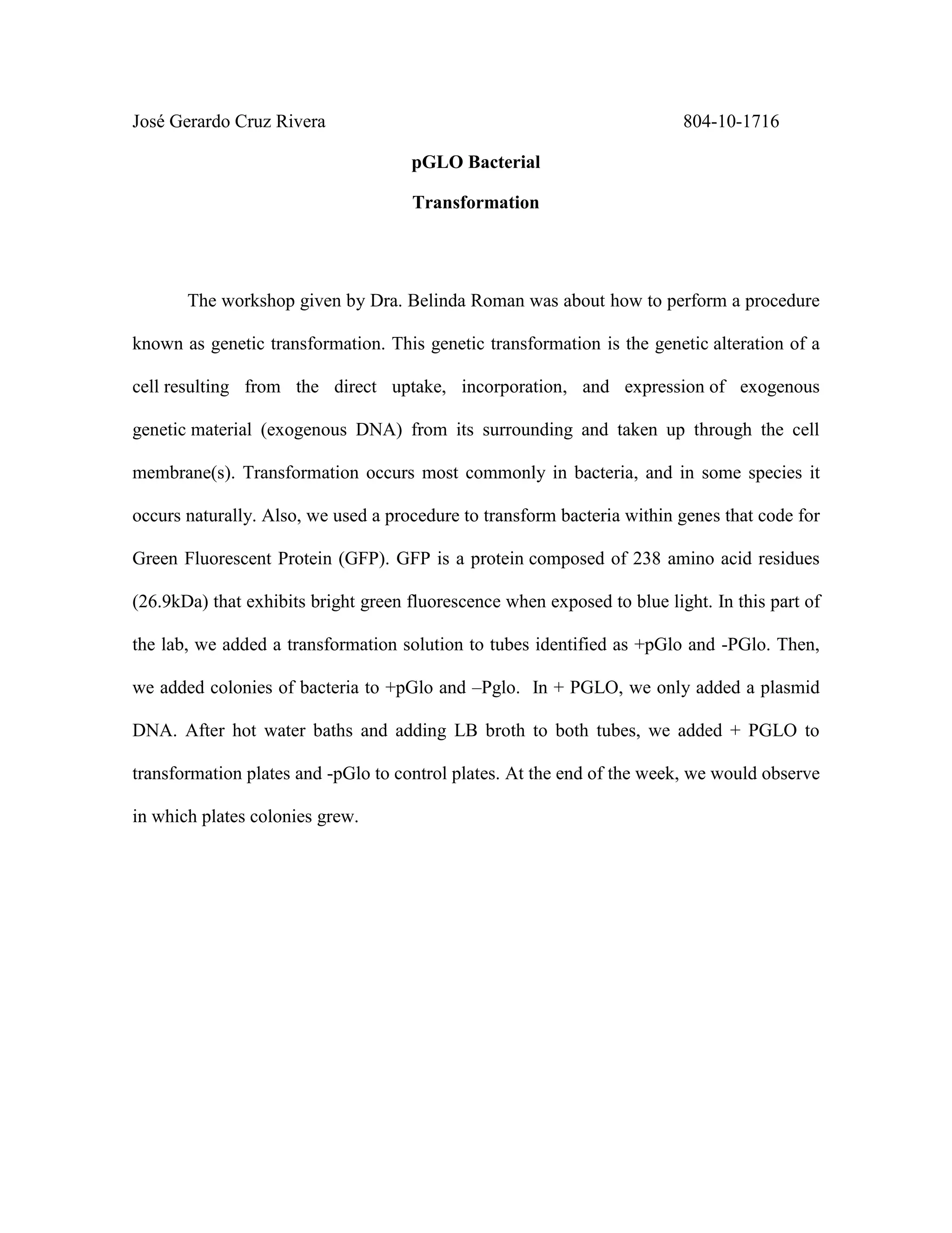 The document summarizes a genetic transformation workshop where students learned how to transform bacteria by adding exogenous DNA. They used a plasmid containing the gene for green fluorescent protein (GFP) to transform bacterial colonies. The transformed bacteria were plated on selective media where only colonies containing the GFP plasmid would grow over the course of a week, demonstrating successful genetic transformation.