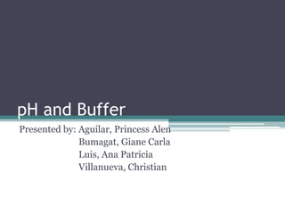 The document discusses pH, buffers, and buffer solutions. It begins by introducing pH and defining buffers. It then outlines the objectives, methodology, data and results of an experiment preparing phosphate and acetate buffer solutions. The results showed the buffers maintained pH when HCl was added. The discussion explains how buffers work to resist pH changes. It concludes that buffers are effective at maintaining pH within their given ranges, and understanding buffers and equations is crucial for preparation and analysis.