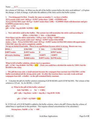 The problems cover topics such as common ion effect, buffer capacity, acid-base titrations, polyprotic acid titrations, and calculating pH changes during titrations. Sample solutions are provided step-by-step to illustrate the various acid-base calculations.