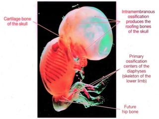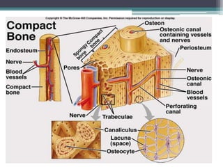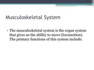 The musculoskeletal system allows for movement of the body and is comprised of bones, muscles, cartilage, tendons and ligaments. The skeletal system provides structure and protection to the body through bones and bone marrow. Bones provide support, protect organs, allow for movement through muscles attaching to them, and store minerals. There are over 200 bones in the human body that make up the axial skeleton (skull, spine, ribcage) and appendicular skeleton (limbs and their attachments).