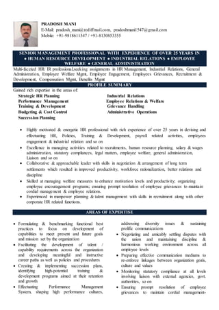 This document contains a summary of Pradosh Mani's experience and qualifications for senior human resources roles. He has over 25 years of experience in human resources management, industrial relations, employee welfare, and general administration. Currently, he works as the Deputy General Manager of HR & GA at H-One India Pvt. Ltd., where he leads HR functions and industrial relations. Previously, he held HR leadership roles at other companies like Luxor International Pvt. Limited and Delhi Stock Exchange. He has expertise in areas like strategic HR planning, performance management, training and development, and grievance handling.