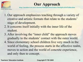 The document discusses an approach to teaching multiplication tables to elementary school students. It emphasizes teaching through creative formats that relate to students' experiences. It involves stimulating students' imagination through storytelling and activities with rhythm. This helps students learn meaningfully by relating the content to their inner lives and experiences with the physical world.
