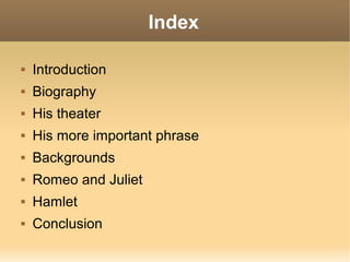 This document provides biographical information about William Shakespeare and summaries of some of his most important works. It details that he was born in 1564 in England and married Anne Hathaway in 1582. It also discusses his body of work, dividing it into comedies, tragedies, and dramas. Two of his most famous works highlighted are Romeo and Juliet and Hamlet.