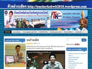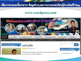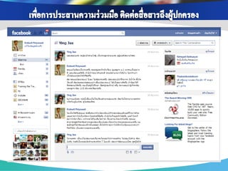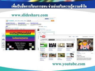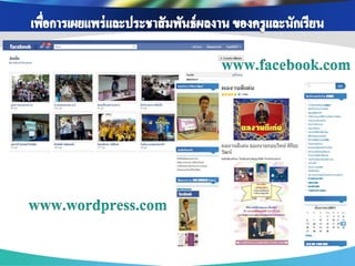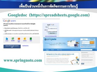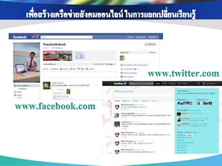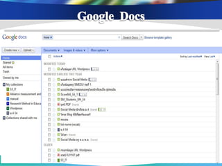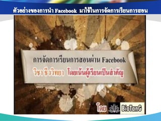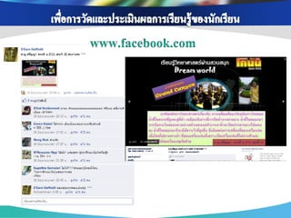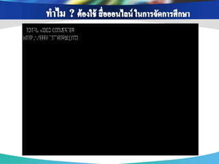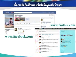 ่ เพือการสื บค้ นข้ อมูล ่ เพือการติดต่ อ สื่ อสาร ่ เพือเป็ นสื่ อการเรียนการ ่ เนือหาสาระ ข้ อมูล ้ แบ่ งปันข้ อมูล แจ้ ง สอน ช่ วยส่ งเสริมความรู้ ออนไลน์ ผ่าน Search ต่ างๆ และรวบรวม ข่ าวสาร ความเข้ าใจ เช่ น Youtube, แหล่งเรียนรู้ ต่างๆโดย engine ต่ างๆ เช่ น เช่ น Facebook , Twitter Scribd Slideshare google ใช้ Blog , Skype เพือเป็ นส่ วนหนึ่งใน ่ เพือสร้ างเครือข่ ายสังคม ่ การจัดกิจกรรมการ การนา Social media ออนไลน์ ในการ เรียนรู้ เช่ น Blog แลกเปลียนเรียนรู้ ่ Mindmeister , ไปใช้ ในการจัดการสอนวิชาต่ างๆ เช่ น Facebook , Twitter googledoc , Blog เพือการดูแลช่ วยเหลือ ่ เพือการอัพโหลดและ ่ เพือการวัดและ ่ แชร์ รูปภาพ/คลิป เพือการเผยแพร่ และ ่ ประเมินผลการเรียนรู้ ติดตาม พฤติกรรม วีดโอ ิ ประชาสัมพันธ์ ผลงาน ของนักเรียน เช่ น ของนักเรียน เช่ น เช่ น Facebook , ของครูและนักเรียน เช่ น Googledoc, Monkey Facebook , Twitter Picasa, youtube survey, Facebook , Twitter , Company LOGO Blog