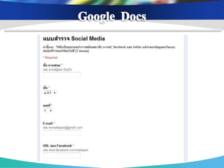 (Docs, Presentation, Spreadsheet) สร้ างฟอร์ มในการเก็บรวบรวมข้ อมูลได้ ง่าย เก็บเอกสาร ไฟล์ งานต่ างๆ