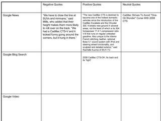 The document discusses reviews and details about the 2008 Cadillac CTS. It provides both positive and neutral quotes about the vehicle from various sources online. Positives included that it breaks new ground with its powerful yet efficient V6 engine and luxurious interior design. One quote commented that the CTS looks good externally and has a stunning interior, with a smooth yet firm ride and handling when needed.