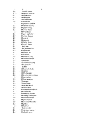 The document appears to be a log of product searches on an online marketplace or shopping website. It lists products searched for along with their corresponding search volumes represented by decimal numbers. The products range from electronics and home goods to clothing, toys, and other miscellaneous items.