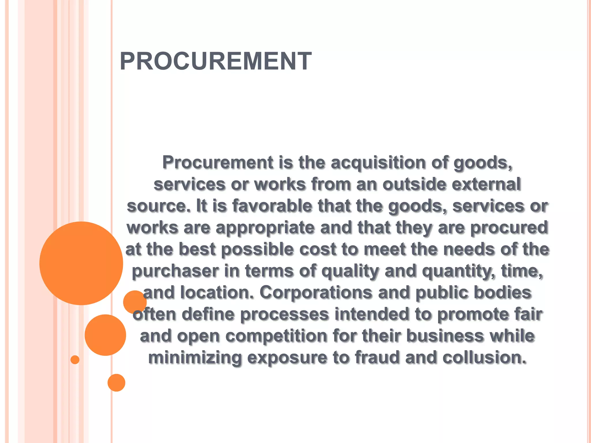 Procurement is the acquisition of goods, services, or works from an external source. It aims to obtain the best quality and cost while promoting fair competition. Considerations in procurement include speed, cost, quality, constraints, risk, ownership, and financing. Public sector procurement uses contracts to increase efficiency and transparency. E-procurement systems manage tenders online globally. Procurement types include single, stock, vendor-managed inventory, just-in-time, and just-in-sequence. Procurement fraud can involve dishonestly obtaining an advantage during the procurement process.