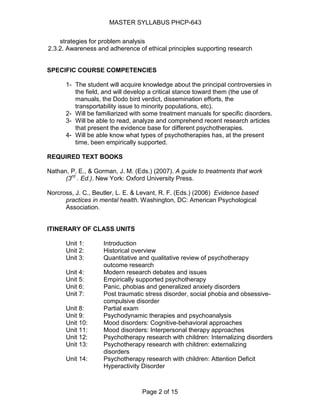 - The course will cover topics like quantitative and qualitative reviews of psychotherapy research, debates around issues like using treatment manuals, and empirically supported therapies for disorders like anxiety, PTSD, and depression.
