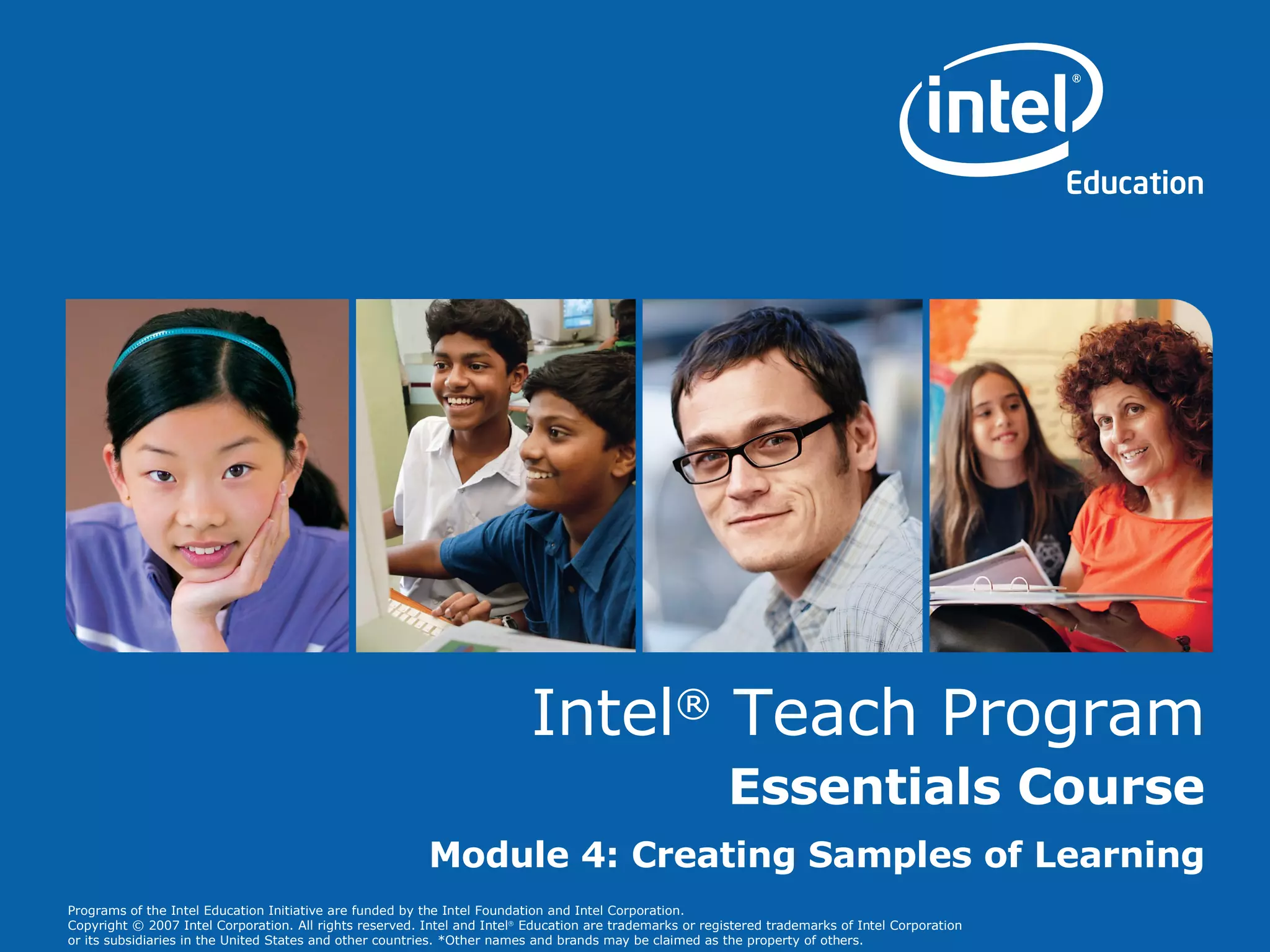 This document outlines Module 4 of an online course on using technology to support student learning. The module focuses on creating student samples to demonstrate learning. Key points covered include answering essential questions, meeting learning objectives, using appropriate technology tools like presentations, publications, wikis and blogs, and ensuring samples align with standards. Activities guide participants to draft instructional procedures, assess a sample, and reflect on applying the lessons to their teaching.