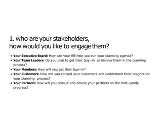 This document provides tips for planning a local committee's activities for the second half of the year. It suggests engaging stakeholders like the executive board, team leaders, and members to obtain buy-in. It also recommends updating information like the SWOT analysis, half-yearly report, key metrics, competitor analysis, and lessons from previous events to inform planning. The document stresses adhering to the local committee's philosophy and values. It proposes using team days for re-planning, team bonding, and priority-setting discussions to define the top goals and projects for the remainder of the year.