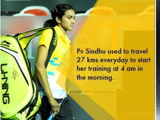 P.V. Sindhu is an Indian badminton player who was born in 1995 in Hyderabad, India. She is currently ranked 3rd in the world in women's singles badminton. Some of her accomplishments include winning a silver medal at the 2016 Rio Olympics, gold medals at the 2017 and 2013 BWF World Championships, and team gold medals at the 2014 Uber Cup and 2016 Uber Cup. She has also won medals at the Asian Games, Commonwealth Games, and South Asian Games.