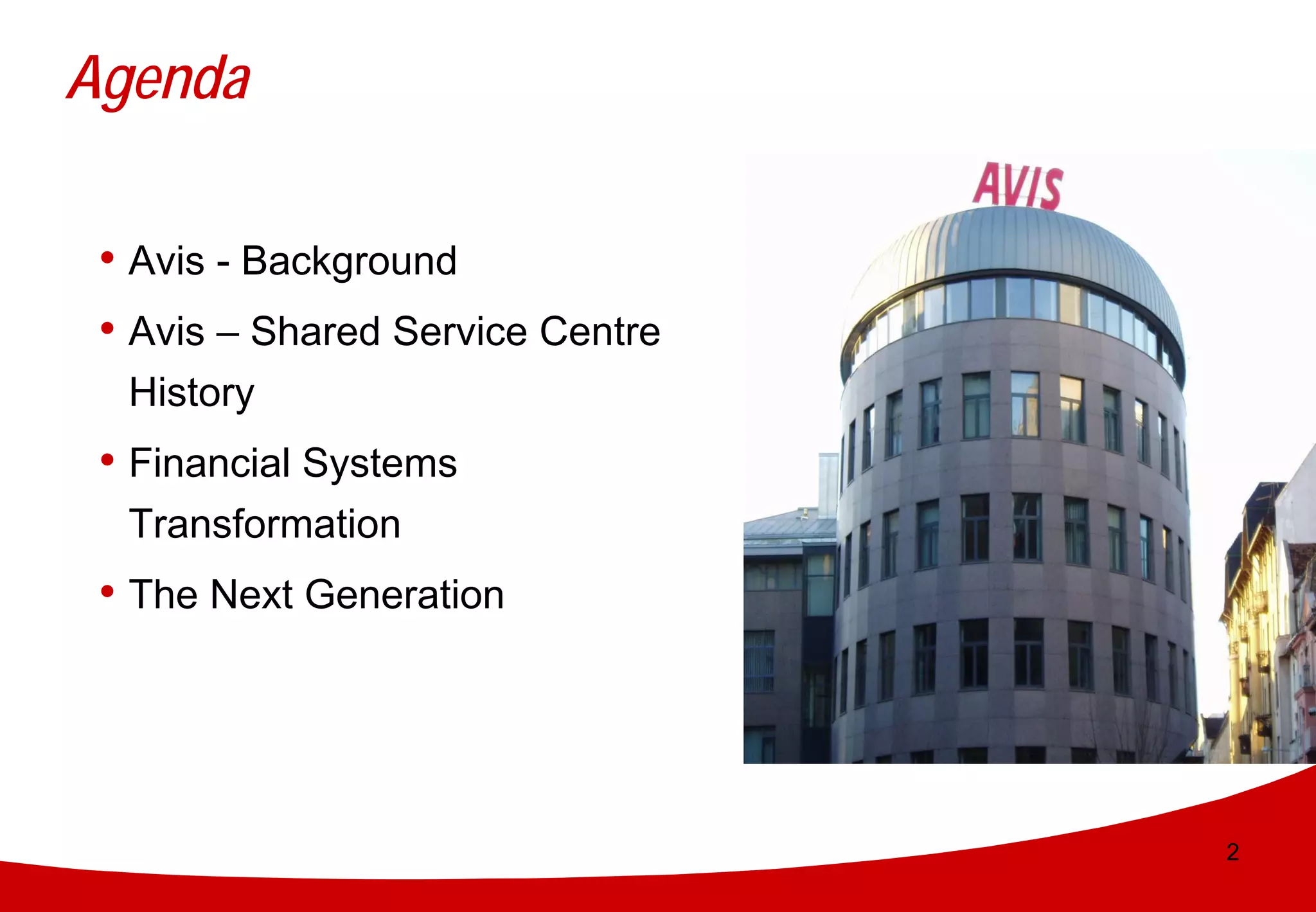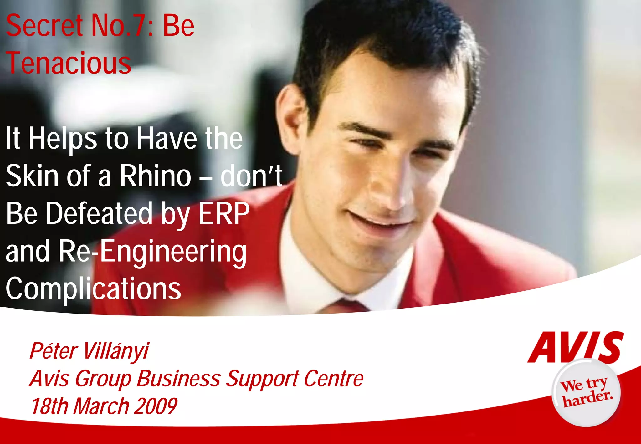 The document outlines Avis Europe's shared service centre history, emphasizing the importance of tenacity in overcoming ERP and re-engineering challenges. Key factors for success include top management support, effective recruitment, and clear communication, along with a focus on customer relations and operational processes. The goal is to implement a new finance system that enhances efficiency, reduces costs, and meets local requirements through modern technology and process standardization.