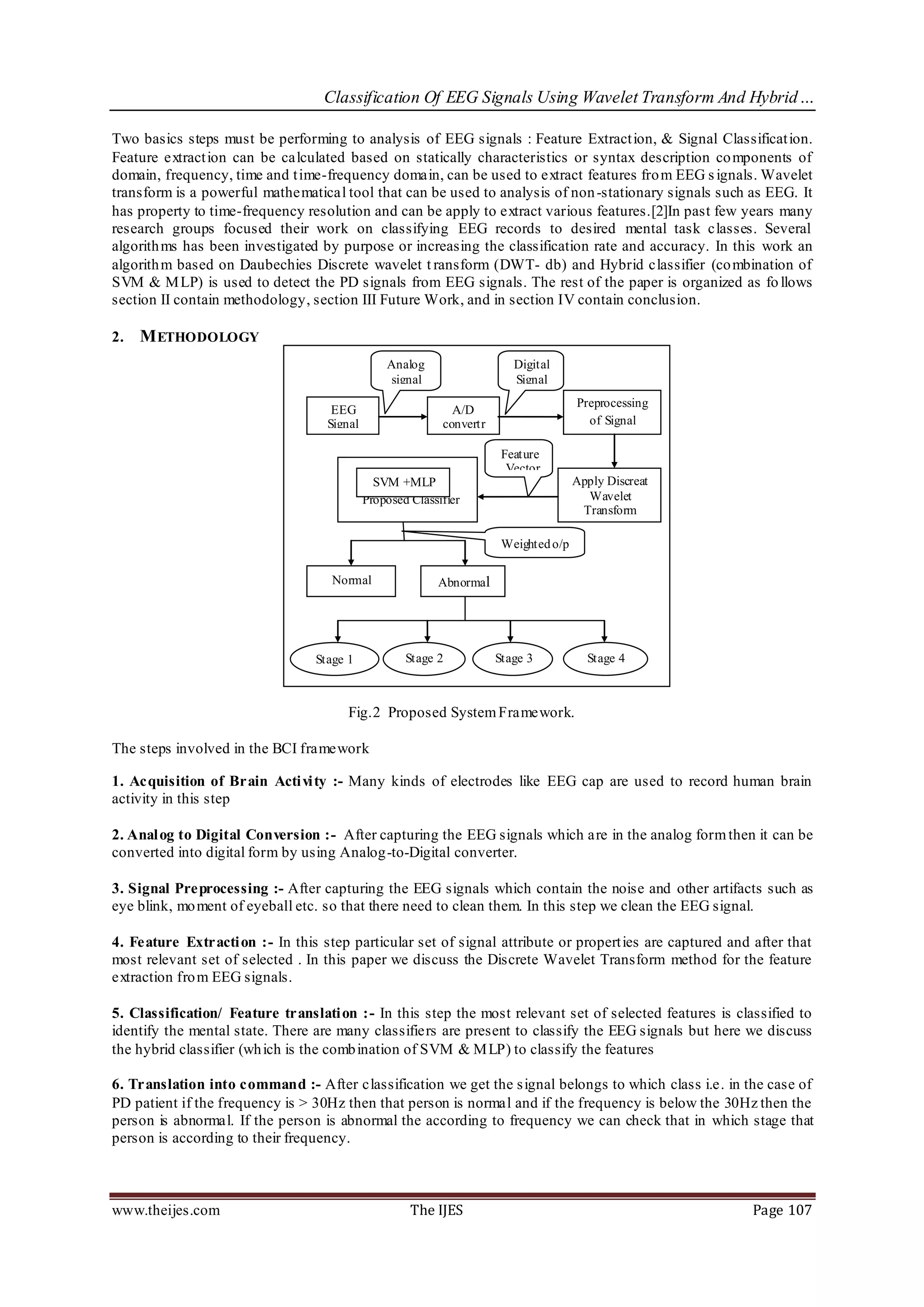 The document discusses a method for classifying electroencephalograph (EEG) signals to detect Parkinson's disease using a hybrid classifier combining Support Vector Machine (SVM) and Multilayer Perceptron (MLP) with discrete wavelet transform for feature extraction. It outlines the steps involved in EEG signal processing, including acquisition, preprocessing, feature extraction, classification, and interpretation. The authors emphasize the advantages of their proposed approach in improving classification accuracy over single classifiers and suggest future work exploring the use of more EEG channels for better performance.
