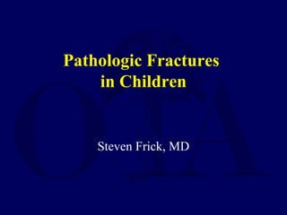 This document discusses pathologic fractures in children. It summarizes that a pathologic fracture occurs through abnormal bone and outlines several potential causes including benign bone lesions like unicameral bone cysts and aneurysmal bone cysts, metabolic bone diseases, skeletal dysplasias, and malignant bone lesions. It emphasizes the importance of being suspicious of every fracture in children and thoroughly investigating to make an accurate diagnosis and guide appropriate treatment.