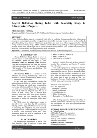 This document discusses using the Project Definition Rating Index (PDRI) combined with a feasibility study to better predict the outcome of infrastructure projects. The PDRI is a rating tool that assesses a project based on categories and elements, with a lower score indicating better scope definition and higher chance of success. While feasibility studies are commonly used for infrastructure projects, some still fail despite positive studies. The document proposes that combining PDRI assessment with feasibility study data can help identify hidden risks and provide a more comprehensive understanding to improve project planning. It then outlines the PDRI assessment process, describing its sections and elements that are rated based on definition levels. Conducting a PDRI study based on feasibility study findings can predict costs,