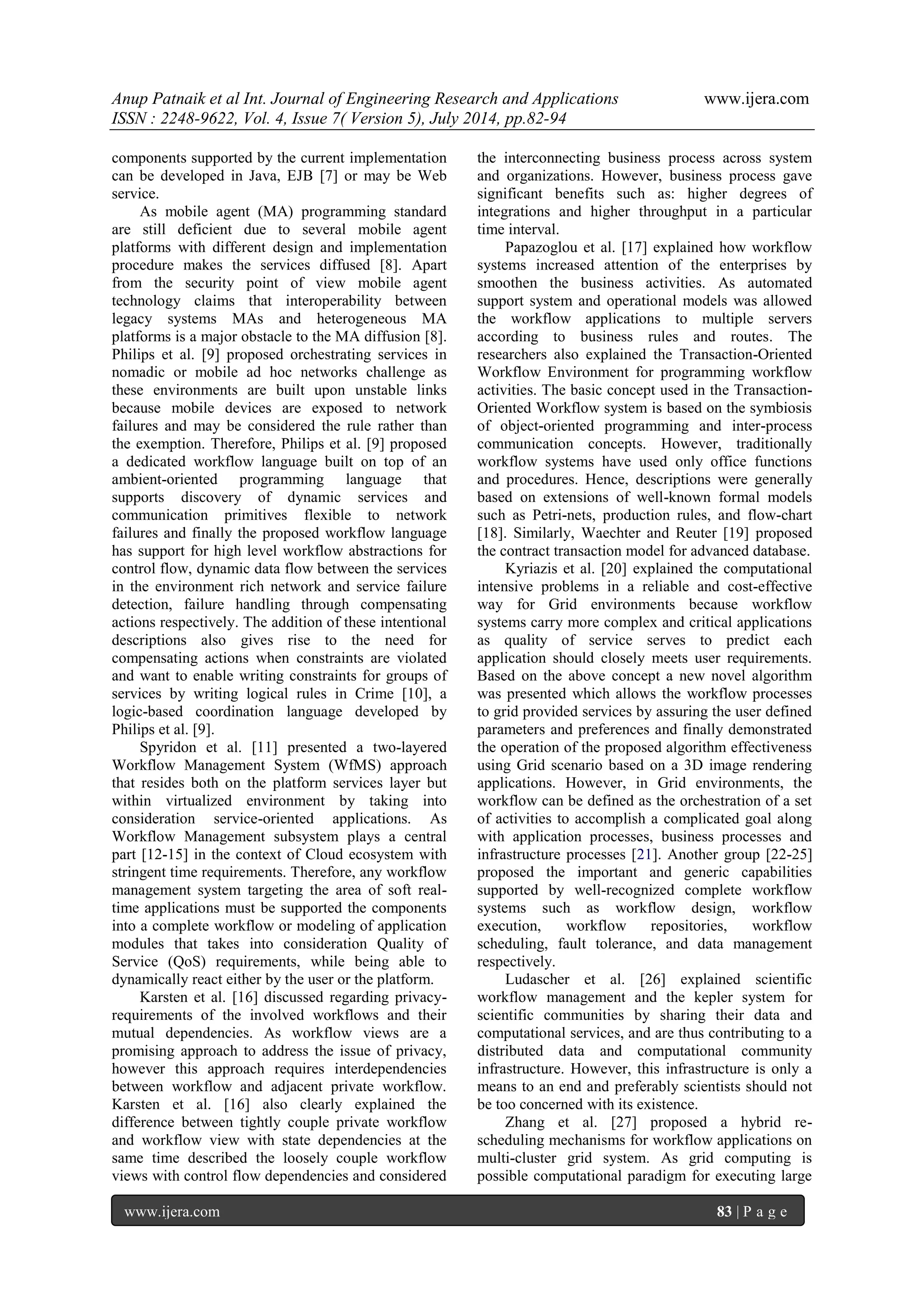This document discusses mobile agent technology for workflow management. It provides an overview of current research on using mobile agents to automate business processes across distributed systems. The document summarizes several related works on topics like inter-organizational workflows, mobile agent communication, coordination techniques, and workflow partitioning and scheduling algorithms. It aims to improve methods for designing and implementing prototype models for mobile agent-based workflow management systems.