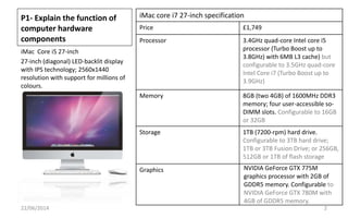The document provides information about various computer hardware components and their functions. It explains that the CPU processes instructions, RAM temporarily stores data and programs, storage devices like hard drives and SSDs permanently store data, and the motherboard connects all the components. Graphics cards generate video output, sound cards facilitate audio input/output, and peripherals like monitors, keyboards, mice, printers, and webcams enable user input and output.