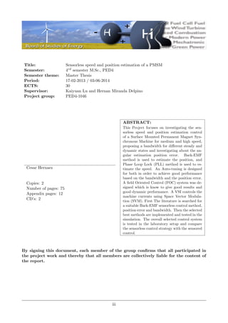 This document describes a master's thesis project focused on sensorless speed and position estimation of a permanent magnet synchronous machine (PMSM). The project investigates sensorless control strategies using a back electromotive force (Back-EMF) method for position estimation and a phase-locked loop (PLL) for speed estimation. A field oriented control (FOC) system is designed to control the PMSM. The objectives are to propose bandwidths for different operating states, investigate angular position estimation errors, and compensate for magnetic saturation effects. Simulation and experimental results are presented to evaluate the sensorless control strategy.