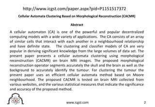 The document summarizes a research paper that proposes a new cellular automata clustering method called Cellular Automata Clustering based on Morphological Reconstruction (CACMR) to identify tumors in brain MRI images. CACMR uses morphological reconstruction to accurately segment the skull, brain, and background, and then employs a cellular automata approach based on Moore neighbourhood to cluster the tumors. The method is tested on brain MRI data from various websites and statistical measures indicate it accurately identifies tumors.