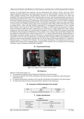 1) The document discusses the performance and emissions of a twin cylinder diesel engine fueled with rapeseed oil blended with methanol.
