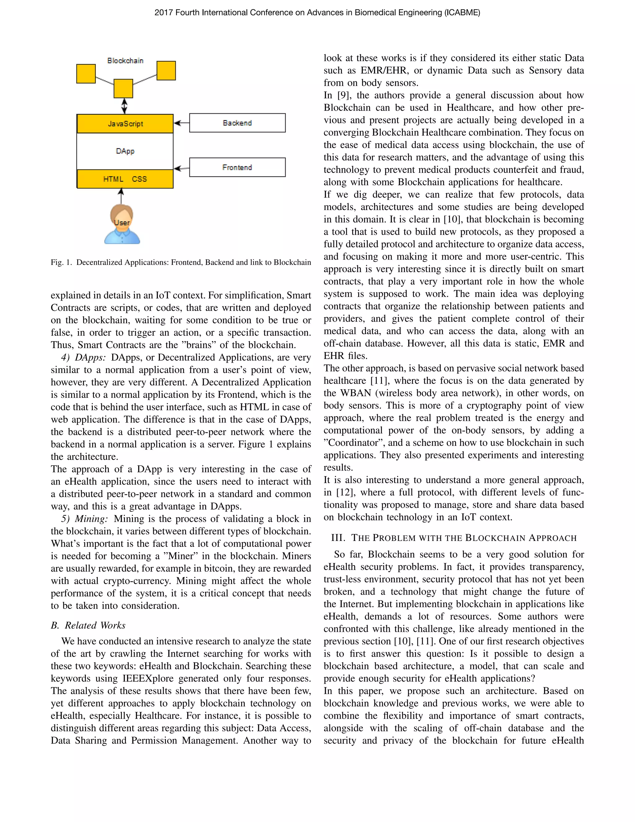 This document proposes using blockchain technology to address challenges with managing electronic health data access and exchange. It summarizes previous related work applying blockchain to eHealth. The key challenges are ensuring data privacy and scalability. The proposed model uses a public blockchain to securely transmit data pointers and notifications, while storing actual health data off-chain in an InterPlanetary File System database. Smart contracts would manage access permissions. This would provide security while addressing blockchain's limitations for large data storage. The model was implemented using Ethereum, IPFS and smart contracts to test the feasibility of the blockchain-based eHealth data management approach.