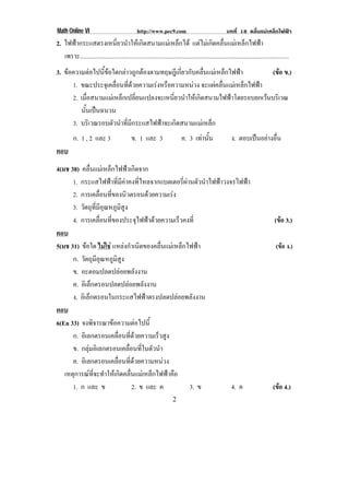 http://www.pec9.com บทที่ 18 คลื่นแมเหล็กไฟฟา 2. ไฟฟากระแสตรงเหนี่ยวนําใหเกิดสนามแมเหล็กได แตไมเกิดคลื่นแมเหล็กไฟฟา เพราะ....................................................................................................................................... 3. ขอความตอไปนี้ขอใดกลาวถูกตองตามทฤษฎีเกี่ยวกับคลื่นแมเหล็กไฟฟา (ขอ ข.) 1. ขณะประจุเคลือนทีดวยความเรงหรือความหนวง จะแผคลื่นแมเหล็กไฟฟา ่ ่ 2. เมื่อสนามแมเหล็กเปลี่ยนแปลงจะเหนี่ยวนําใหเกิดสนามไฟฟาโดยรอบยกเวนบริเวณ นันเปนฉนวน ้ 3. บริเวณรอบตัวนําที่มีกระแสไฟฟาจะเกิดสนามแมเหล็ก ก. 1 , 2 และ 3 ข. 1 และ 3 ค. 3 เทานน ้ั ง. ตอบเปนอยางอืน ่ ตอบ 4(มช 38) คลื่นแมเหล็กไฟฟาเกิดจาก 1. กระแสไฟฟาที่มีคาคงที่ไหลจากแบตเตอรี่ผานตัวนําไฟฟาวงจรไฟฟา 2. การเคลือนทีของนิวตรอนดวยความเรง ่ ่ 3. วัตถุที่มีอุณหภูมิสูง 4. การเคลื่อนที่ของประจุไฟฟาดวยความเร็วคงที่ (ขอ 3.) ตอบ 5(มช 31) ขอใด ไมใช แหลงกําเนิดของคลื่นแมเหล็กไฟฟา (ขอ ง.) ก. วัตถุมีอุณหภูมิสูง ข. อะตอมปลดปลอยพลังงาน ค. อิเล็กตรอนปลดปลอยพลังงาน ง. อิเล็กตรอนในกระแสไฟฟาตรงปลดปลอยพลังงาน ตอบ 6(En 33) จงพิจารณาขอความตอไปนี้ ก. อเิ ลกตรอนเคลอนทดวยความเรวสง ่ื ่ี ็ ู ข. กลุมอิเลกตรอนเคลือนทีในตัวนํา ่ ่ ค. อเิ ลกตรอนเคลอนทดวยความหนวง ่ื ่ี เหตุการณที่จะทําใหเกิดคลื่นแมเหล็กไฟฟาคือ 1. ก และ ข 2. ข และ ค 3. ข 4. ค (ขอ 4.) ! #!