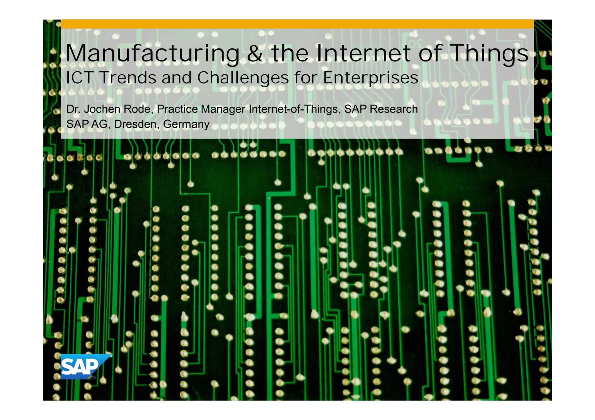 The document discusses the integration of the Internet of Things (IoT) in manufacturing, highlighting the increasing number of connected devices projected to reach 50 billion by 2020. It outlines major challenges and needs associated with IoT applications, such as predictive maintenance, asset management, and the importance of security. The document is a preliminary version from SAP Research, intended to provide insights without being binding or fully comprehensive.