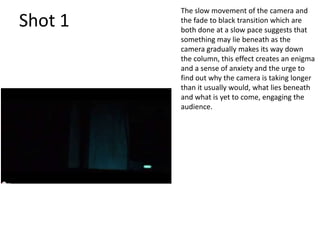 The 9 shots gradually build tension and mystery as the camera slowly moves through an empty parking lot accompanied by unsettling Christmas music. Shot 1 sets up intrigue around what may lie beneath. Shot 2 pauses on the letters "P2", deepening the enigma. Shot 3 suggests something could be ahead as the camera progresses with minimal changes. Shot 4 reveals the camera is first-person, implying the man is intoxicated or paranoid. Shot 5 centers on an isolated car, increasing its significance. Shots 6-7 focus on "P2" and the man's car, keeping the audience pondering. Shots 8-9 build tension as the man approaches his car's boot, from which an eye appears,