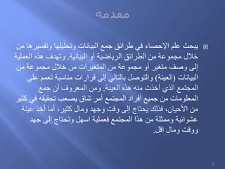يتناول هذا المستند طرق جمع وتحليل البيانات في علم الإحصاء، مع التركيز على مفاهيم العينة والبيانات الوصفية. يستعرض المستند أدوات وتطبيقات الإحصاء مثل الجداول المتقاطعة، واختبار الفرضيات، واختبارات t. كما يقدم خطوات عملية لإجراء التحليل الإحصائي وإعداد الجداول البيانية والتقارير.