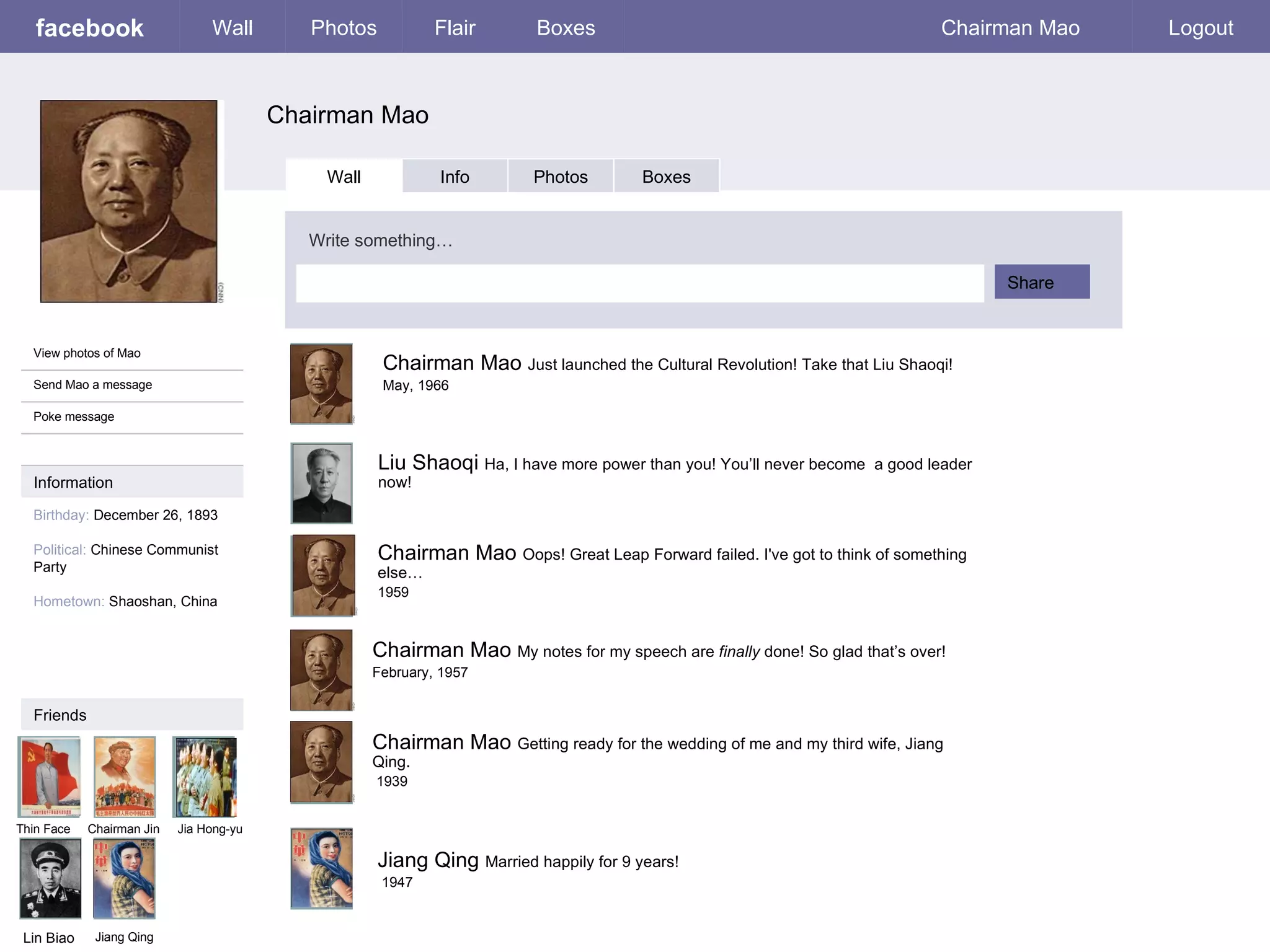 This document contains profiles for Chinese Communist leader Mao Zedong and other officials on a social media site, including biographical details, interests, and recent status updates posted by Mao and others about political events in China such as the Cultural Revolution and struggle sessions. The profiles also include photos of Mao and contact information for him.