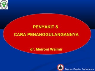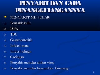 Dokumen ini membahas berbagai penyakit menular, termasuk penyakit kulit, infeksi mata, dan penyakit saluran pernapasan, beserta gejala, pencegahan, dan pengobatan untuk masing-masing penyakit. Beberapa contoh penyakit yang disebutkan adalah kudis, kadas, cacar air, dan influenza. Metode pencegahan berfokus pada kebersihan pribadi dan lingkungan, serta penghindaran kontak dengan penderita.