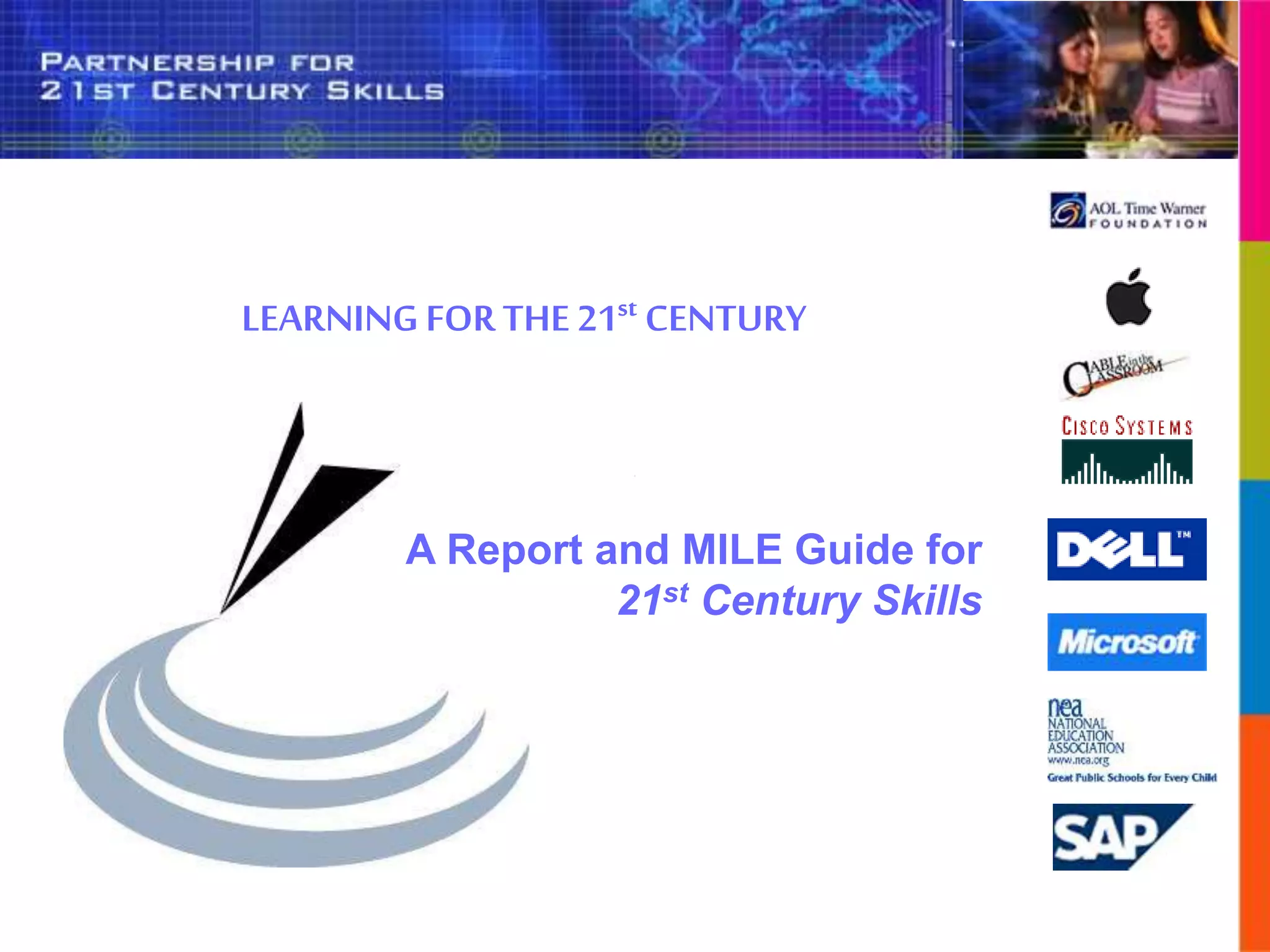 The document provides an overview of a report and MILE Guide for 21st century skills created by the Partnership for 21st Century Skills. It defines what 21st century skills are through six elements: core subjects, learning skills, 21st century tools, 21st century context, 21st century content, and assessment. It then describes what the MILE Guide is and how it can be used to benchmark progress in learning and teaching, leading and managing, and partnering. Finally, it outlines nine steps organizations can take to build momentum in incorporating 21st century skills.
