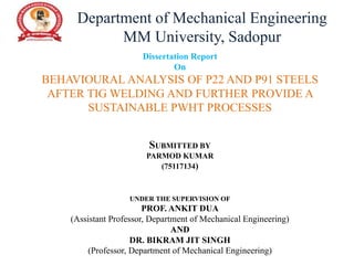 The document is a dissertation report submitted by Parmod Kumar that examines the behavioural analysis of P22 and P91 steels after TIG welding and post weld heat treatment (PWHT) processes. It includes an introduction to the materials, literature review on welding of P22 and P91 steels, identified research gaps, methodology adopted for the experimental plan, findings from the experiments, results and discussion, and plans for future work. The experimental plan involves TIG welding of P22 and P91 steel samples, analyzing hardness and microstructure after welding, conducting PWHT at varying hold times, and assessing the impact of PWHT on hardness and microstructure.
