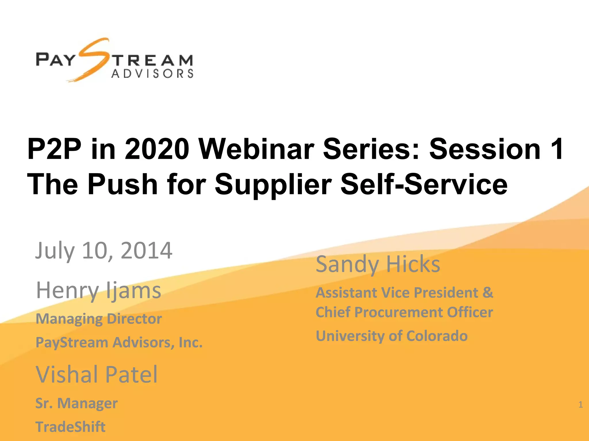 This document summarizes a webinar on supplier self-service featuring speakers Sandy Hicks from the University of Colorado, Vishal Patel from TradeShift, and Henry Ijams from PayStream Advisors. Sandy Hicks discussed the University of Colorado's efforts to automate their supplier registration process. Vishal Patel discussed how TradeShift is addressing the gap between consumer and business systems by providing a platform for suppliers and buyers to communicate and collaborate. The webinar covered trends in purchase-to-pay automation and strategies that innovative organizations are implementing.