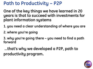 James Cox presented on a Path to Productivity (P2P) program for improving plant operations through data analytics and visualization. The presentation discussed developing a clear path forward by understanding the current state, desired future state, and reasons for change. The P2P program offers options like dashboards, assessments, pilots and guidance. Dashboards can visualize key metrics to monitor objectives like production efficiency, quality and costs. Examples showed real dashboards for packaging lines, energy use and overall performance. Keys to success include defining the right metrics and visualizations aligned to business goals, focusing on actionable insights, and starting with quick wins. The next steps discussed analyzing objectives, data sources and infrastructure to determine the best path forward for the client.
