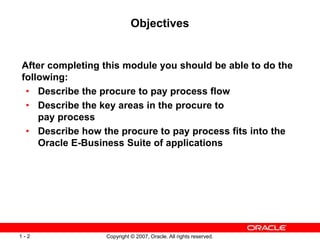 The document describes the procure to pay lifecycle in Oracle applications. It outlines the key steps in the process including requisitions, purchase orders, receiving, invoicing, and payment. It also provides an overview of how the procure to pay process integrates with other Oracle applications like assets, accounting, payables, inventory, and order management. After reviewing the document, users should understand the procure to pay flow, its main components, and how it fits within Oracle's E-Business Suite.